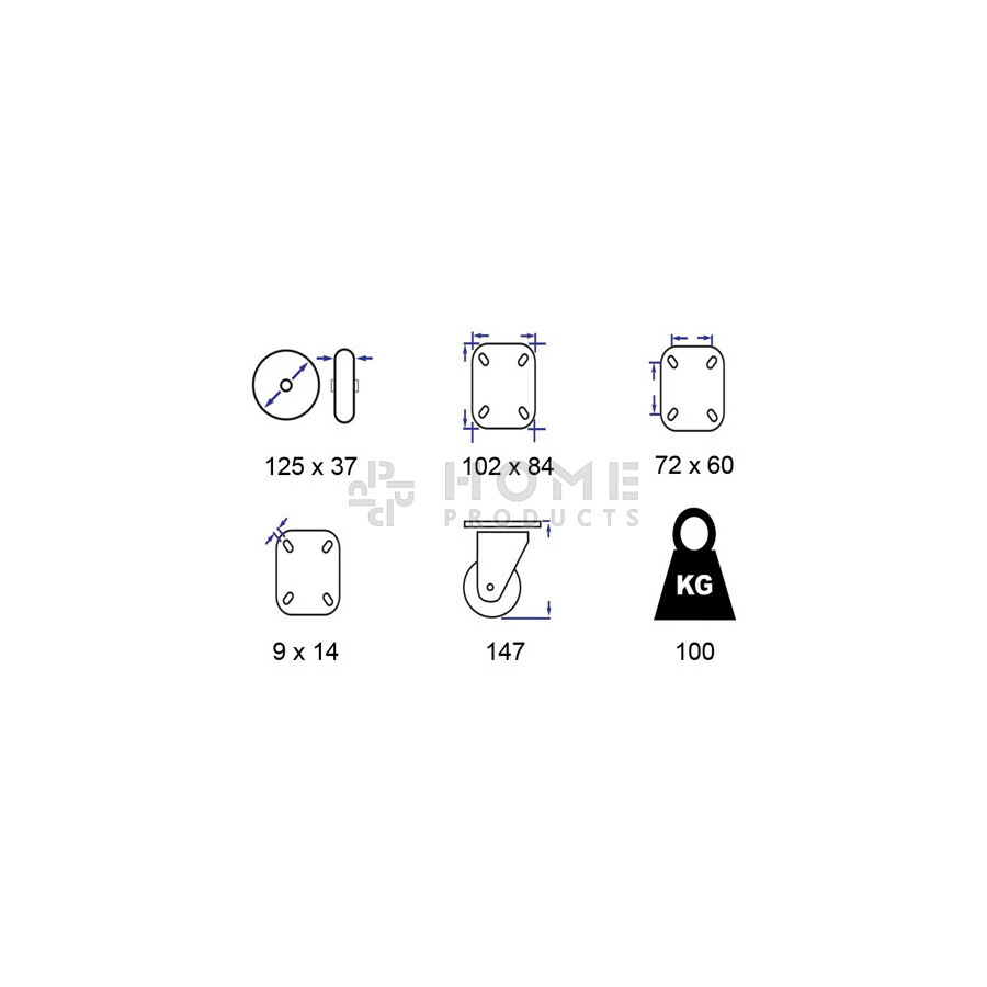 Zwenkwiel, diameter van 125mm, zwarte rubberband, metalen velg, draagvermogen tot 100KG