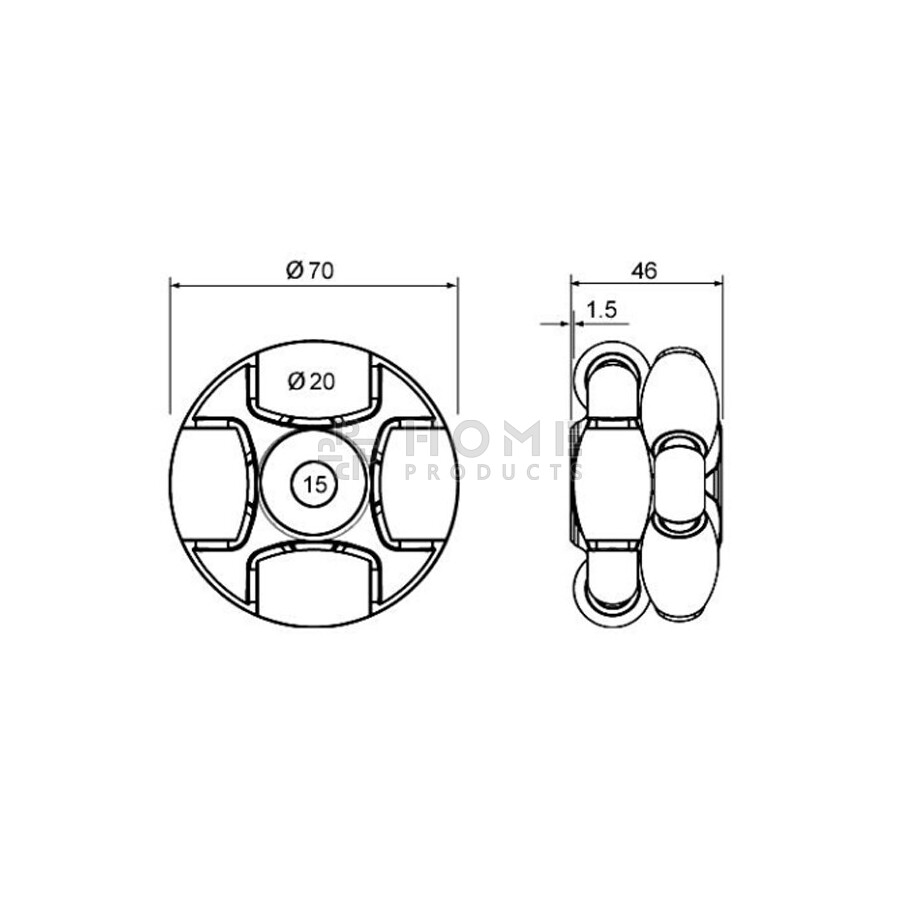 Multidirectioneel wiel met 8 rollers, 70 mm